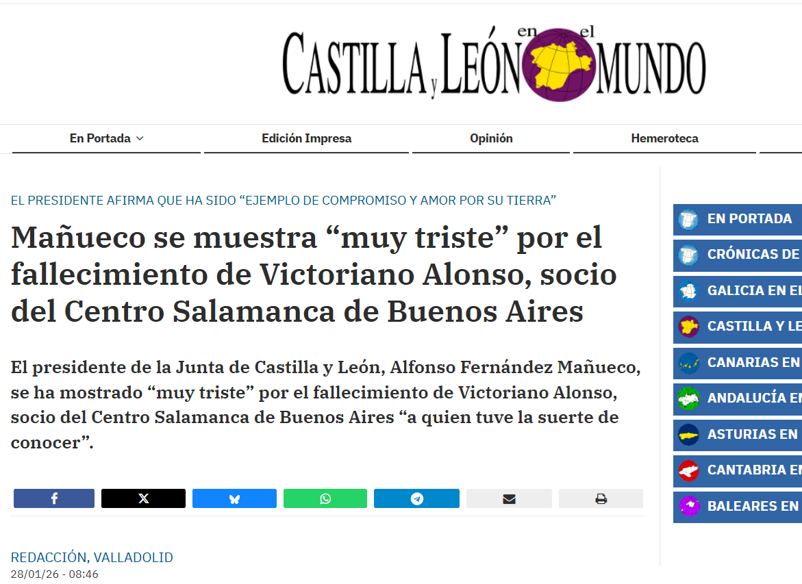 Crónicas de la Emigración> Mañueco se muestra “muy triste” por el fallecimiento de Victoriano Alonso, socio del Centro Salamanca de Buenos Aires
